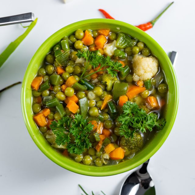 Cauli, broccoli, peas, French beans, garlic, carrots, green peppers