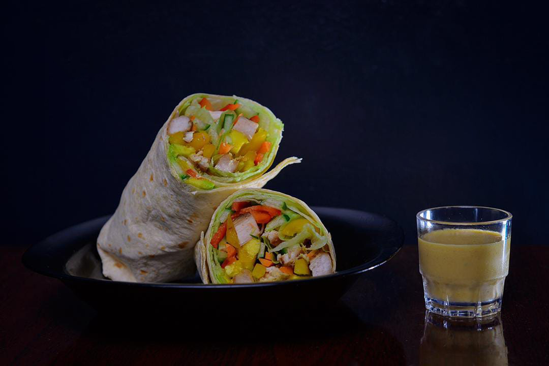 Whole wheat torilla wrap, lettuce leaf, avacado bell peppers, cucumber, onions, carrots, chicken with creamy mustard dressing