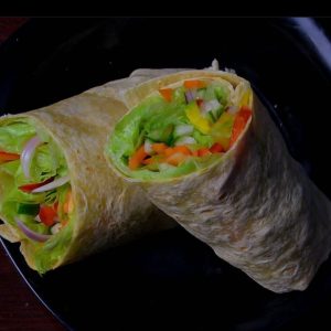 Whole wheat tortilla wrap, lettuce, avocado bell peppers, cucumber, onions, carrots with creamy mustard dressing